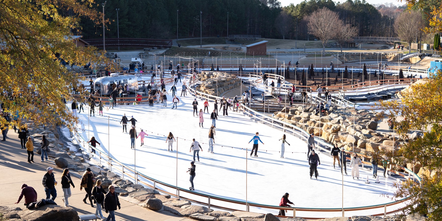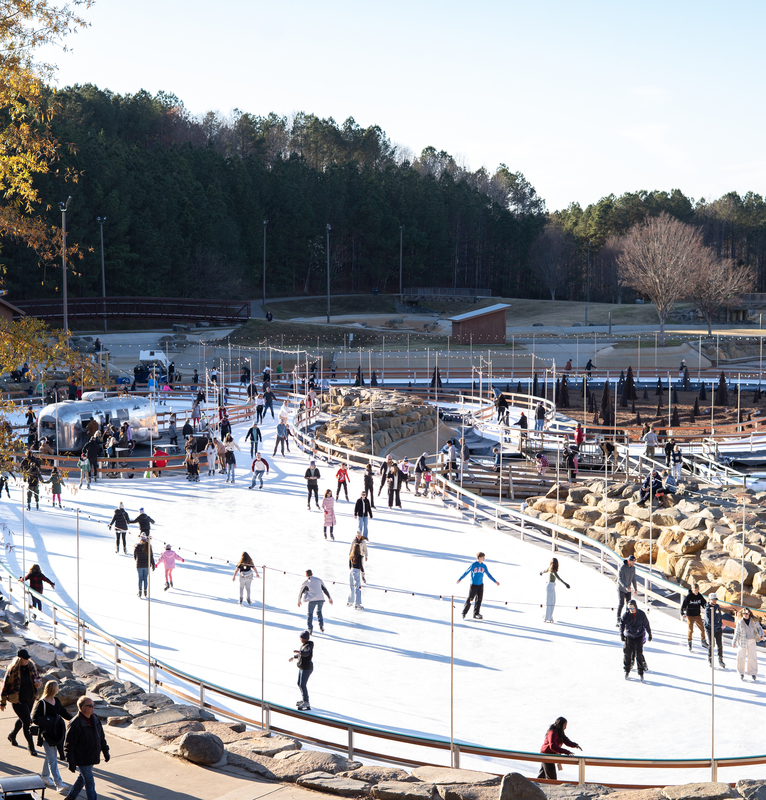 Every November, the upper pond of the Whitewater River converts into a 24,000 sq ft ice skating center, the largest ice rink in the Southeast. The Whitewater Center features four distinct skating areas including two ice trails, two free skate zones, and an Airstream in the middle of the rink serving hot and cold beverages.